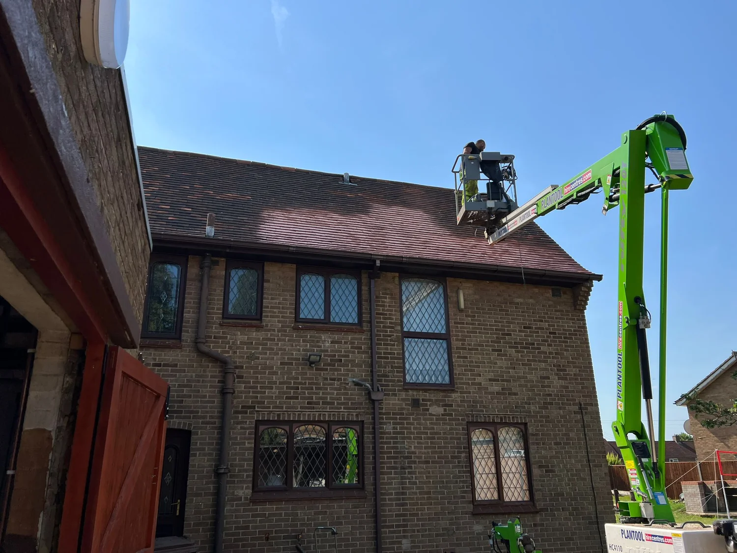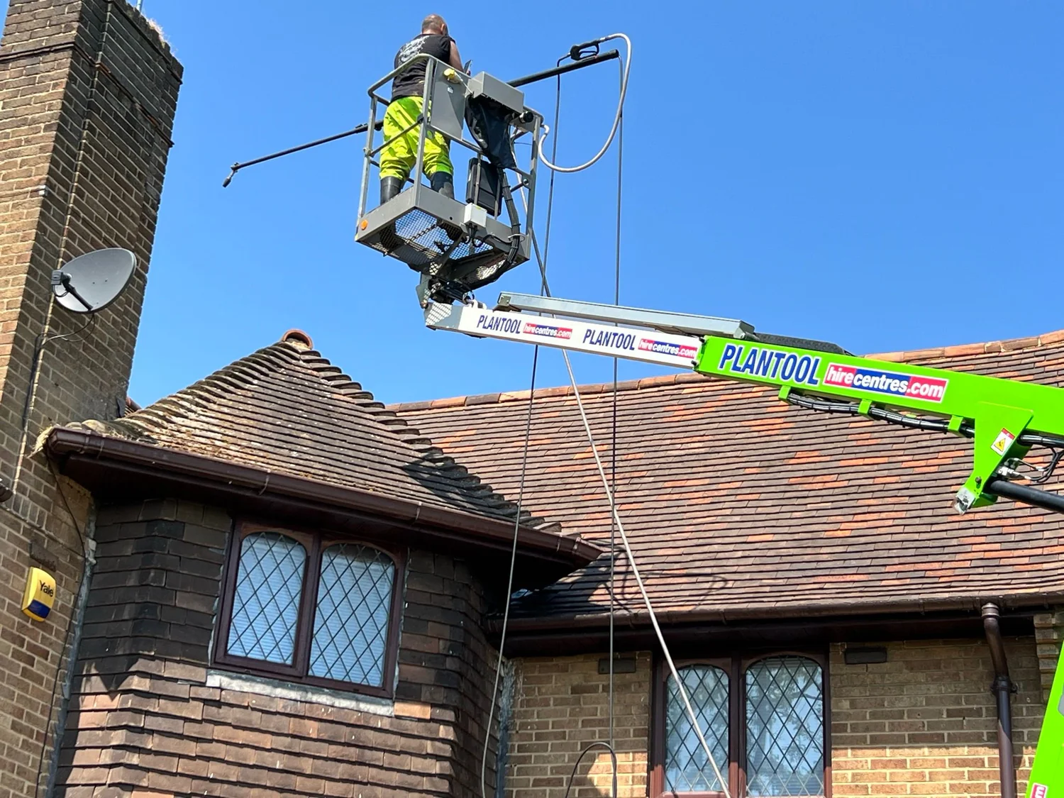 Height and roof geometry meant standard ladder access was not practical or safe for this job. A MEWP (cherry picker) was required to reach all areas of the roof safely and to allow consistent working across each section.