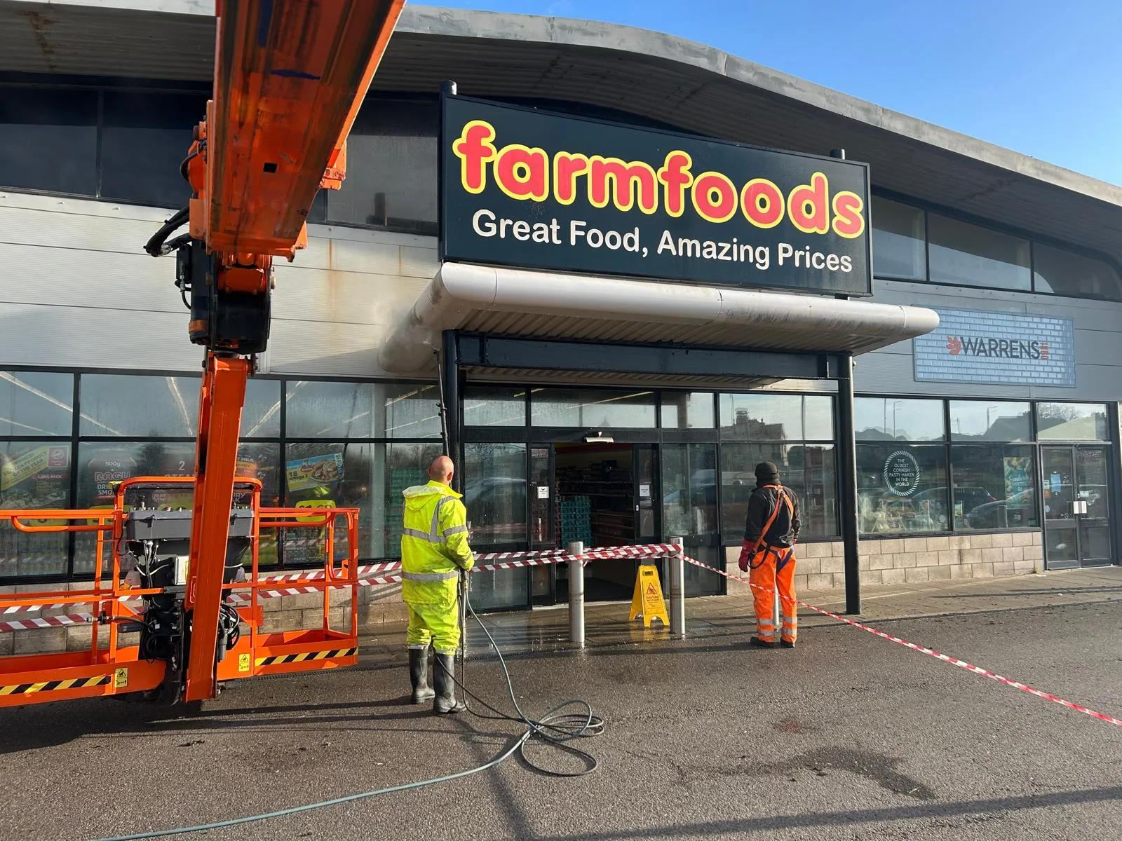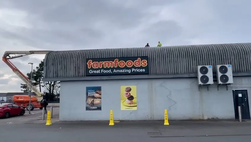 Full commercial exterior cleaning project at Farmfoods supermarket in Crownhill, Plymouth. The scope covered the entire building exterior - roof cleaning, cladding wash, frontage and signage area, and the car park entrance. Roof-level work was carried out using a MEWP cherry picker for safe access to all elevated sections.