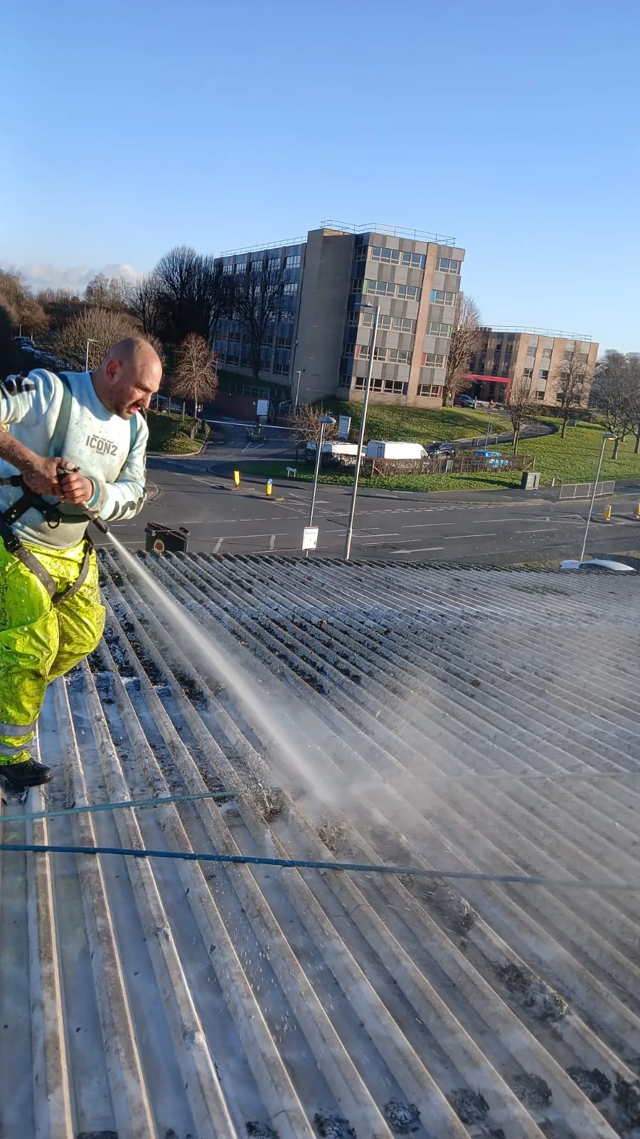 - Roof cleaning - working systematically around ventilation units, skylights, and plant equipment on the corrugated profile