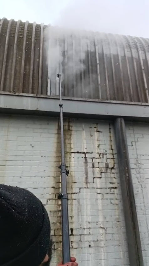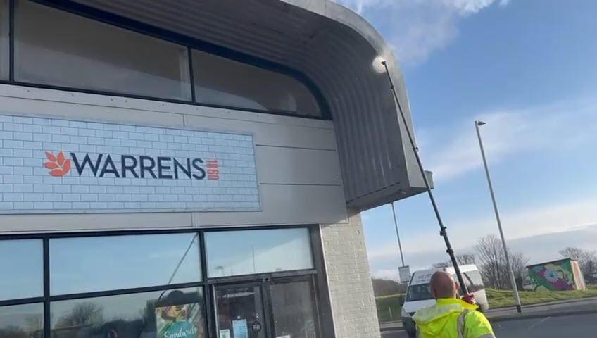 Professional cleaner using telescopic lance to pressure wash commercial supermarket entrance canopy showing cleaning in progress at Farmfoods