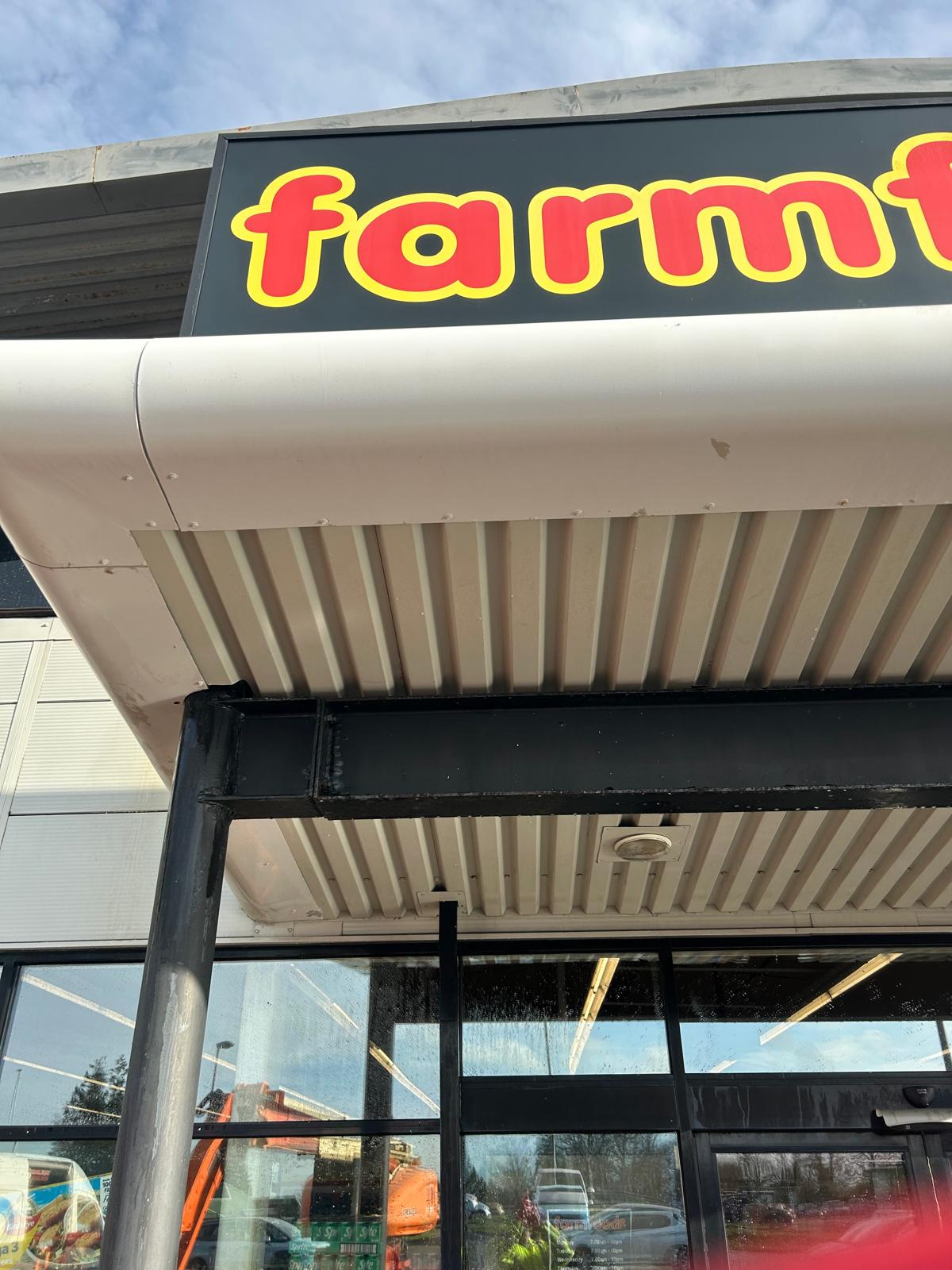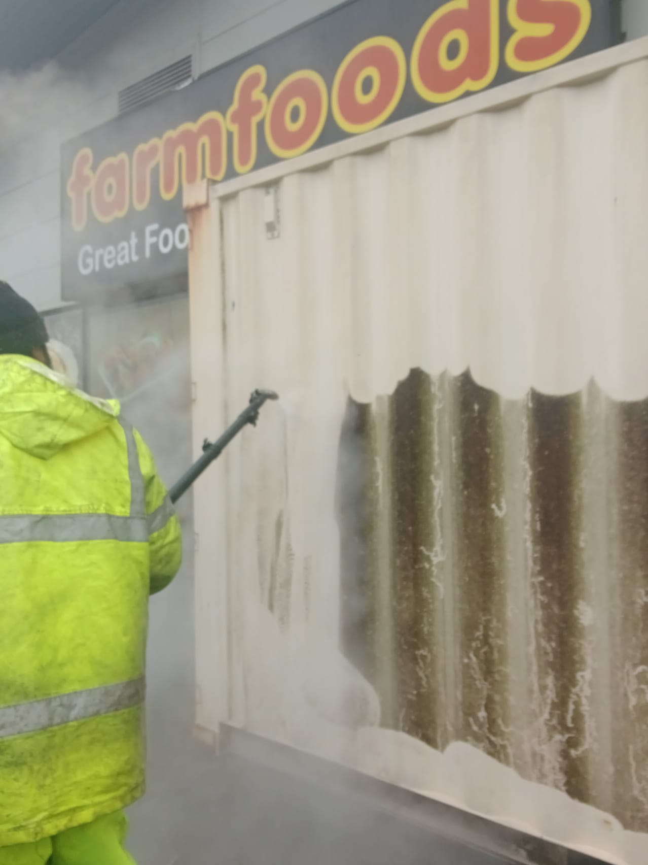In February 2025, we completed a full exterior clean of the Farmfoods supermarket at Plumer Road, Crownhill, Plymouth, PL6 5DZ. The scope included the corrugated metal roof, building sides/cladding, entrance canopy & frontage, plus sidewalks and surrounding hard surfaces.