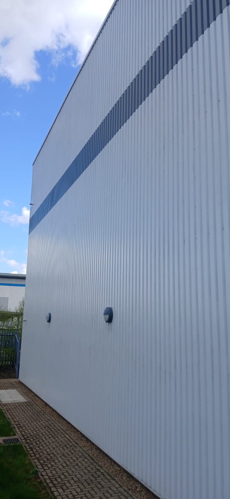 We completed a comprehensive exterior clean for a large commercial warehouse and distribution facility in Desborough’s industrial estate (Kettering area), Northamptonshire. The project was delivered over 3 days and included metal cladding cleaning, roof cleaning, gutter/box gutter clearance and cleaning, plus solar panel cleaning using pure water systems.