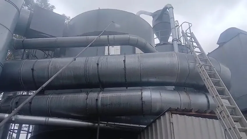 Industrial processing facilities accumulate contamination differently to standard commercial buildings. At this site, the extraction tower and associated pipework/ductwork had built up a layer of industrial grime, dust, and organic growth that was clearly visible against the metal surfaces. The cladding across the main building elevations showed typical weathering - algae streaking, general soiling, and discolouration that worsened on shaded faces.