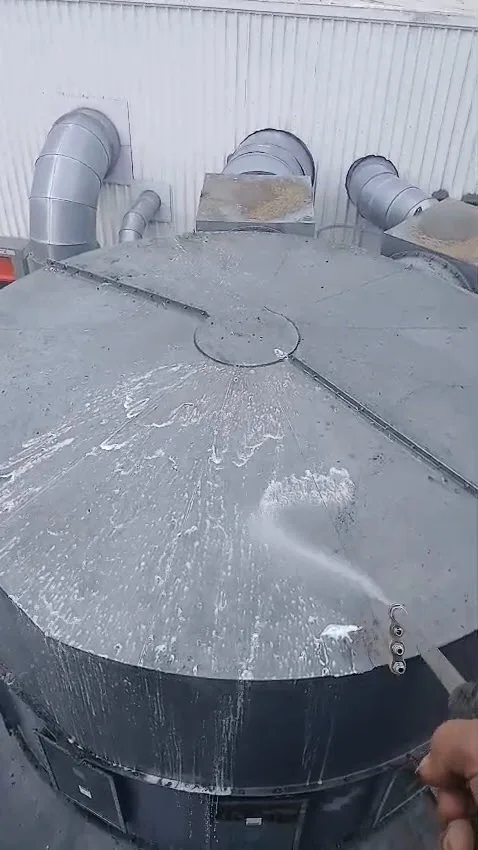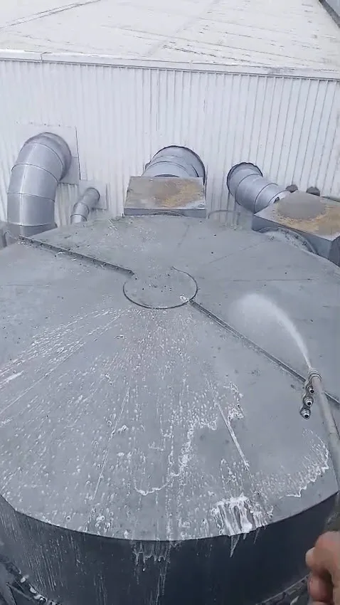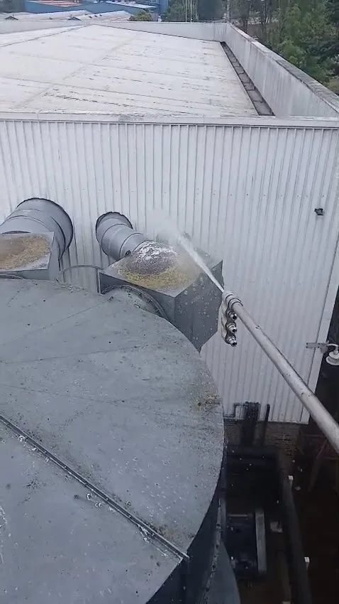 - Pressure washing - cladding, roof, and extraction system - Metal cladding across all accessible elevations was pressure washed to remove algae, soiling, and weathering. The extraction tower, ductwork, and pipework were cleaned using a combination of direct pressure washing and telescopic reach equipment to cover the full height and angles of the system. Accessible roof zones were also cleaned where safe to do so.