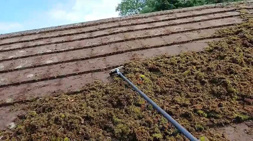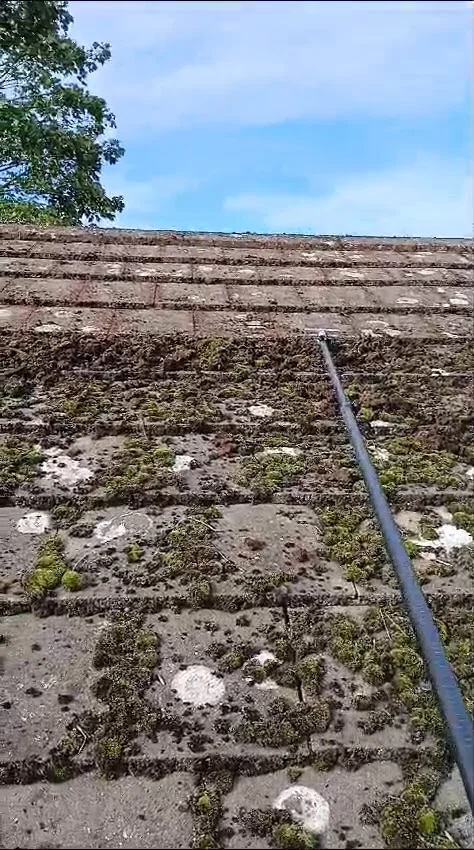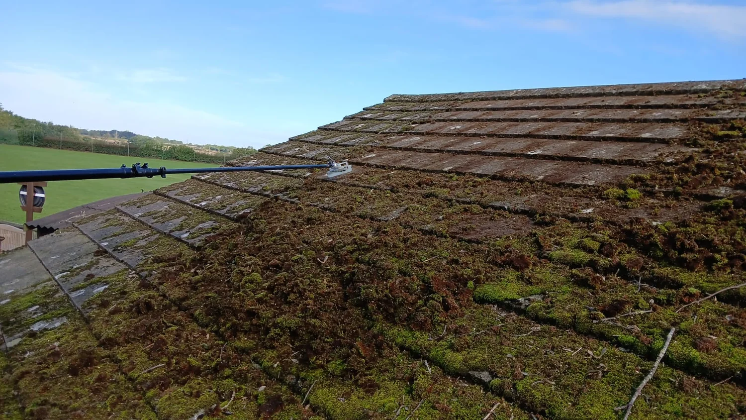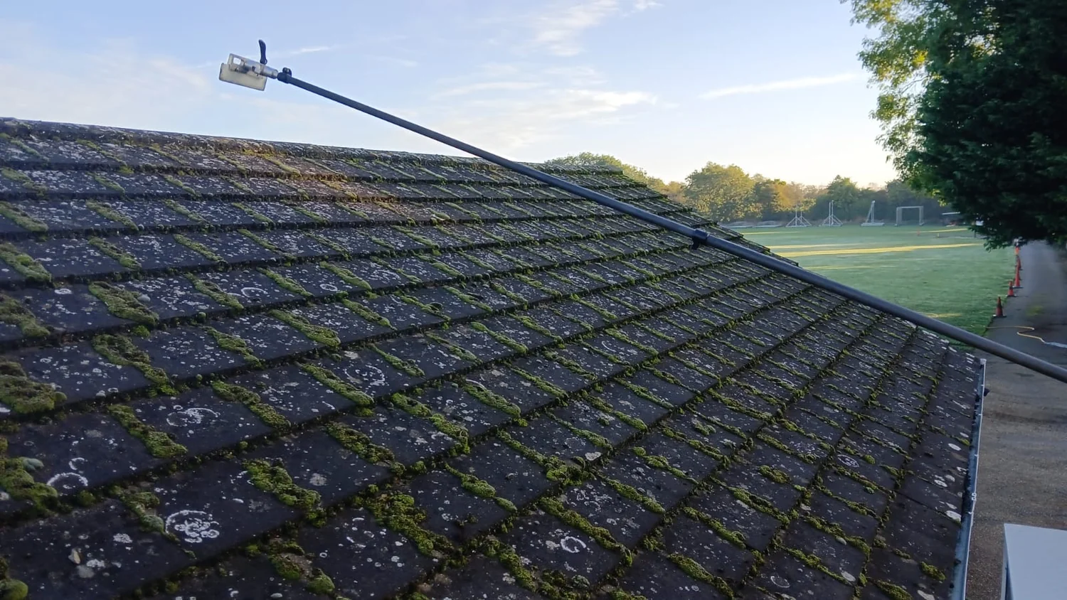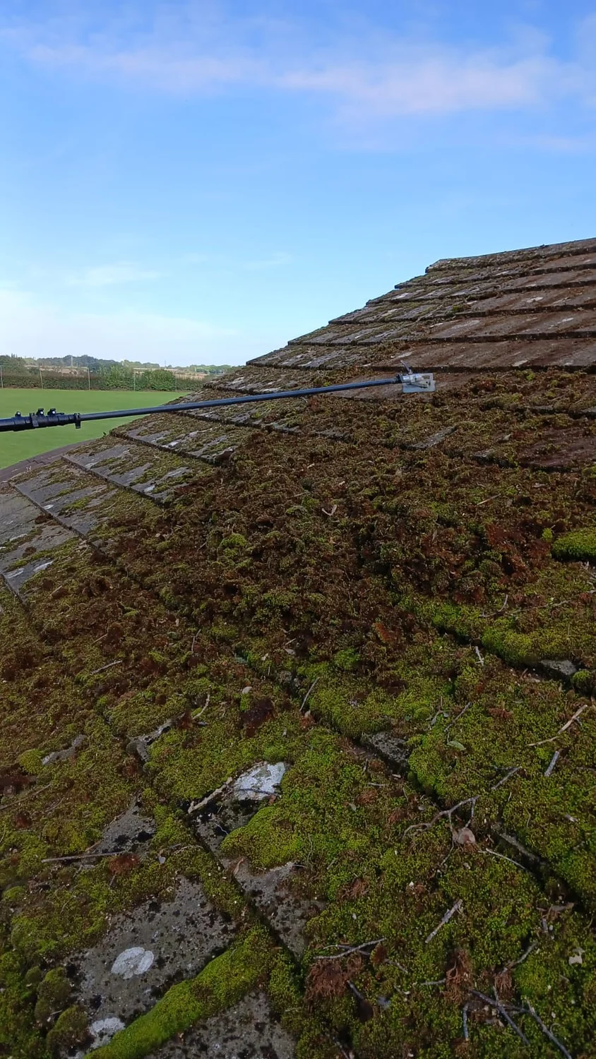 - Manual moss scraping - working from ridge to eave, removing the bulk of the moss growth by hand to avoid tile damage from high-pressure methods