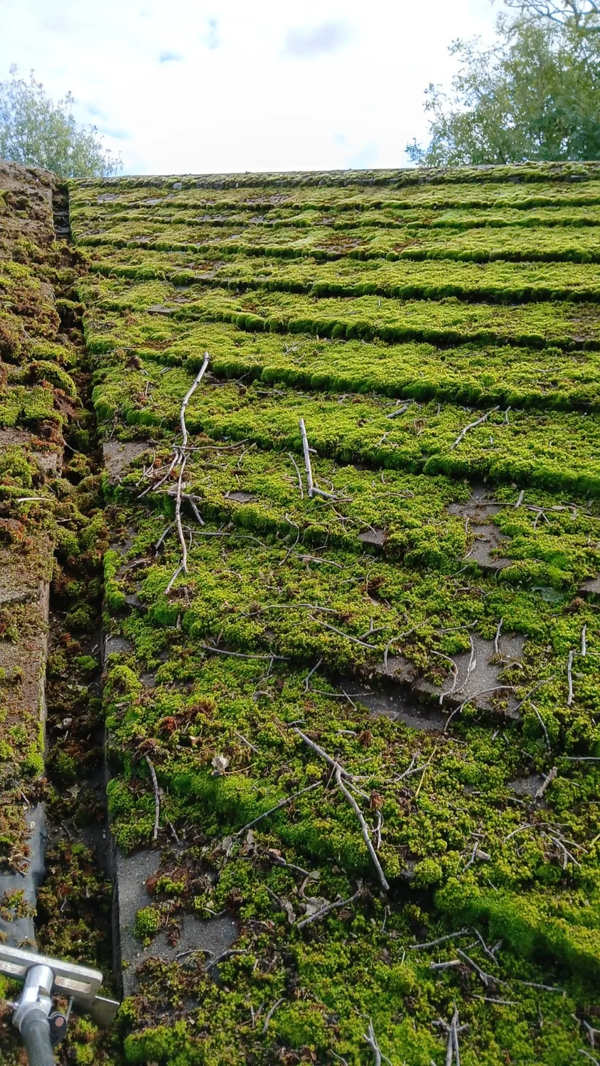 Thick moss had become well established in the ridges and valleys, with growth spreading across the tile faces. Aggressive cleaning risked damaging the concrete tiles, so a controlled approach was essential. The gutters were also blocked with moss debris that had washed down from the roof surface over time.