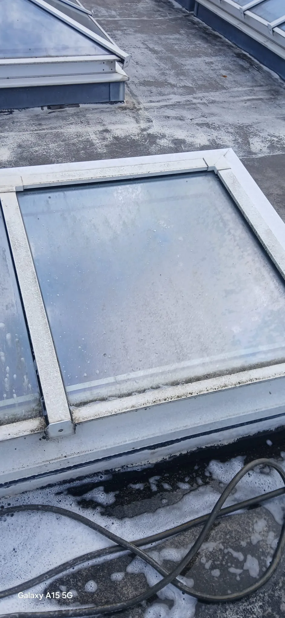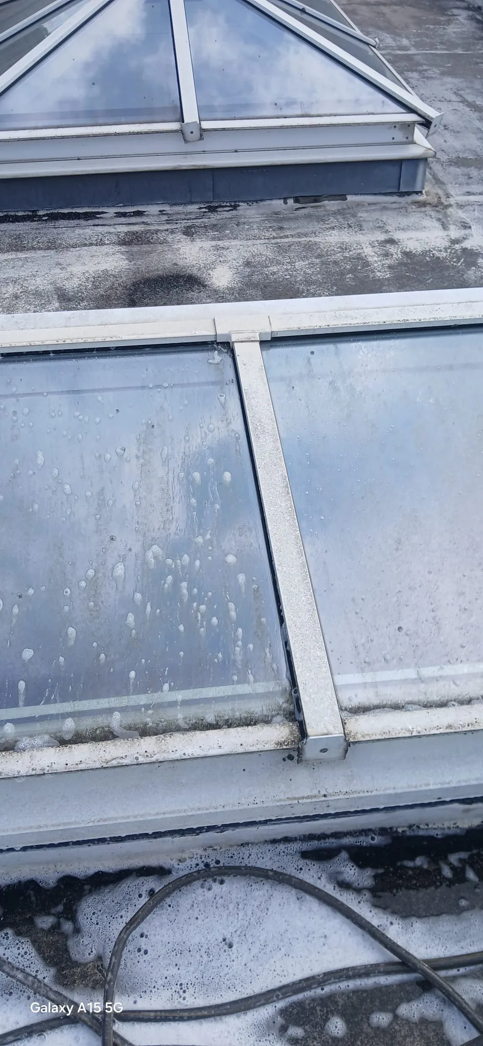 - Skylights needing clarity restored: Multiple skylights were dulled by grime, algae residue, and water marks. The glass and frames needed cleaning without leaving streaks or chemical residue that could affect seals.
