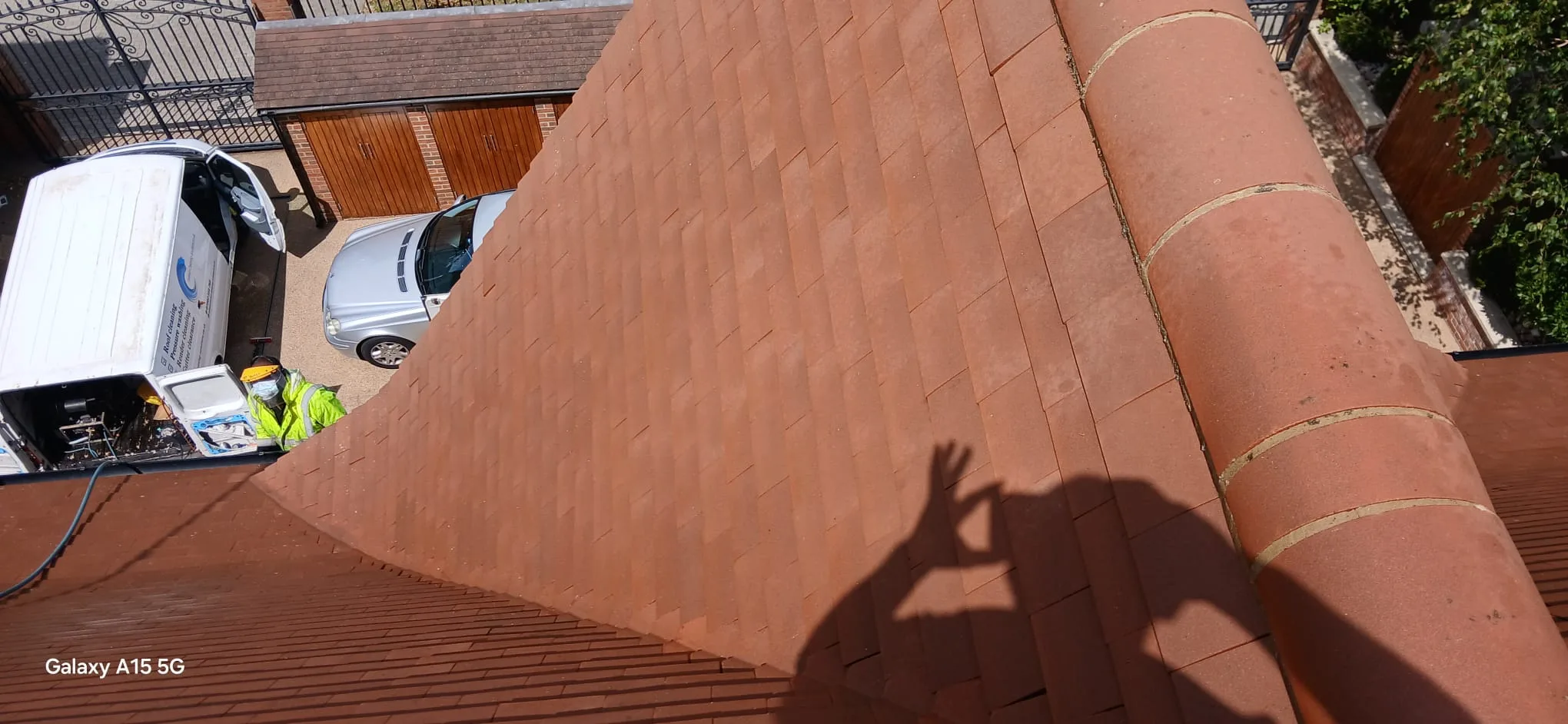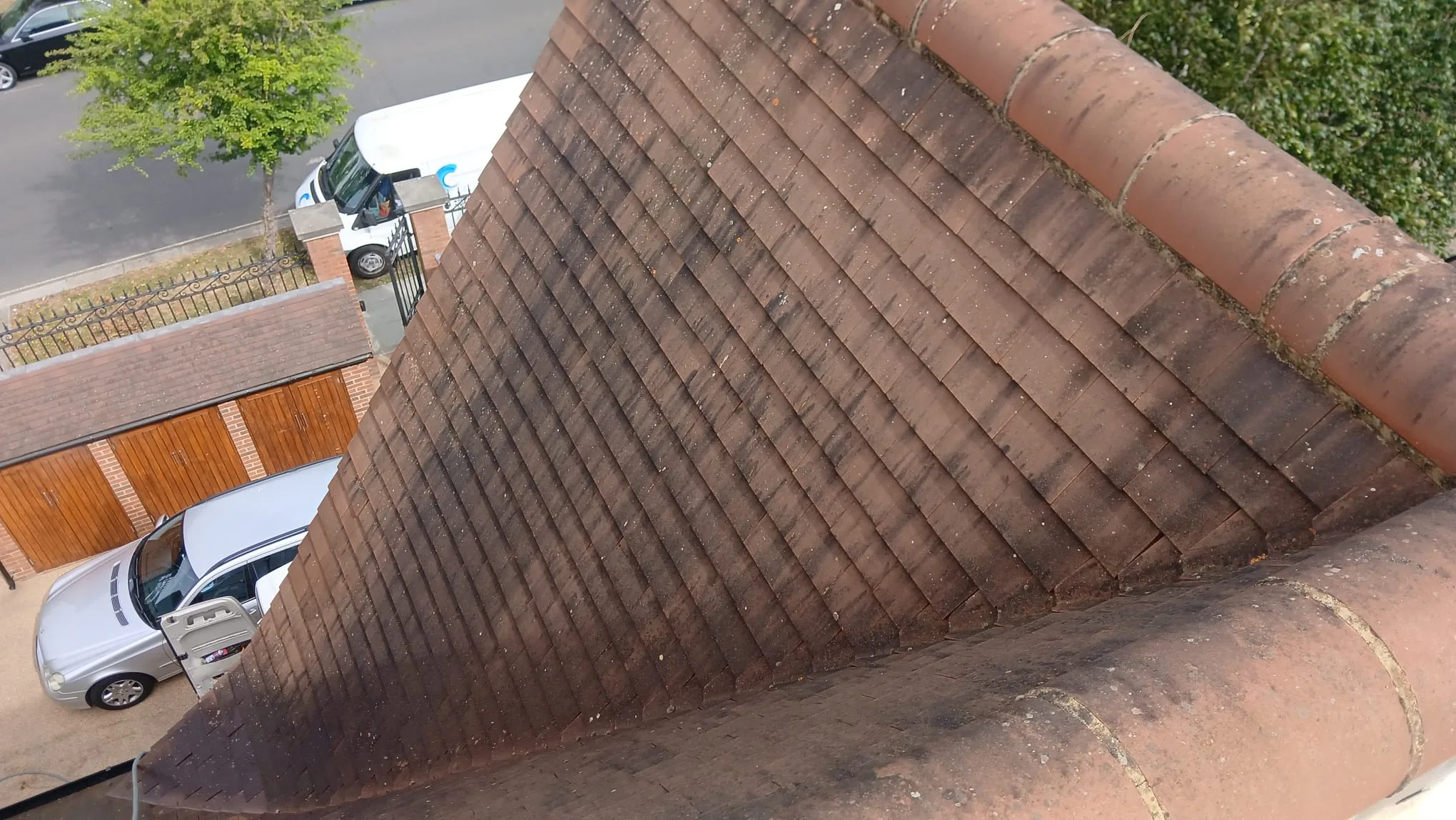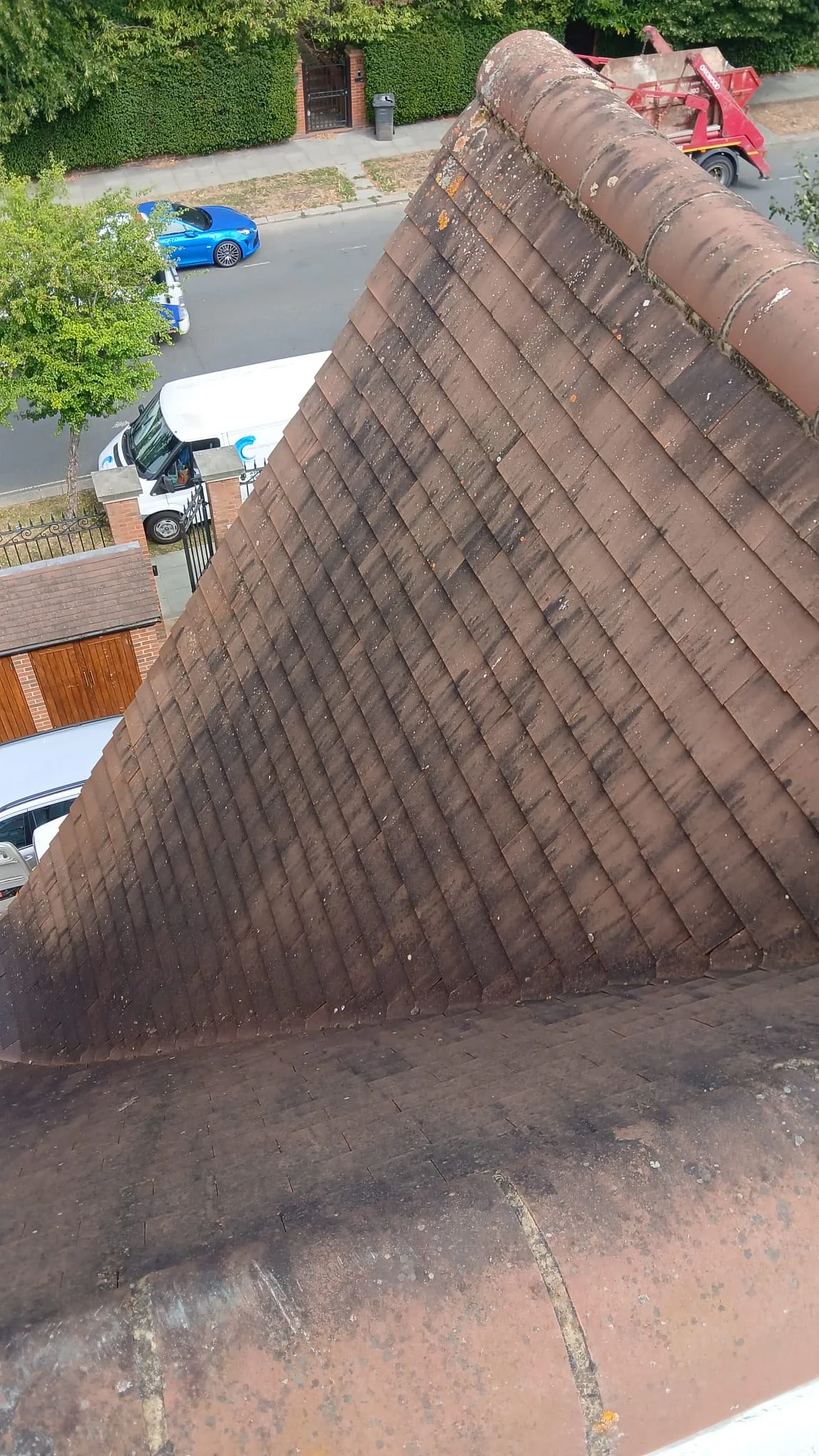 We used steam cleaning across the full roof area. Steam lifts organic growth and surface grime without the impact force of pressure washing, which is critical on clay tiles where mechanical damage can cause cracking and moisture ingress. The high-temperature steam kills algae and moss at the root level, giving a more thorough clean than surface-level rinsing alone.