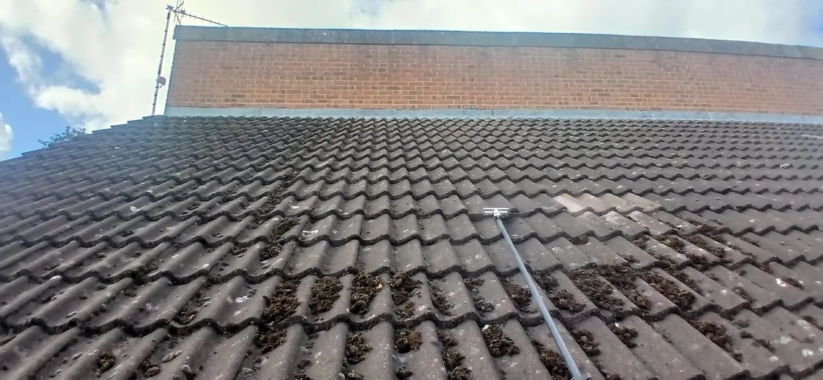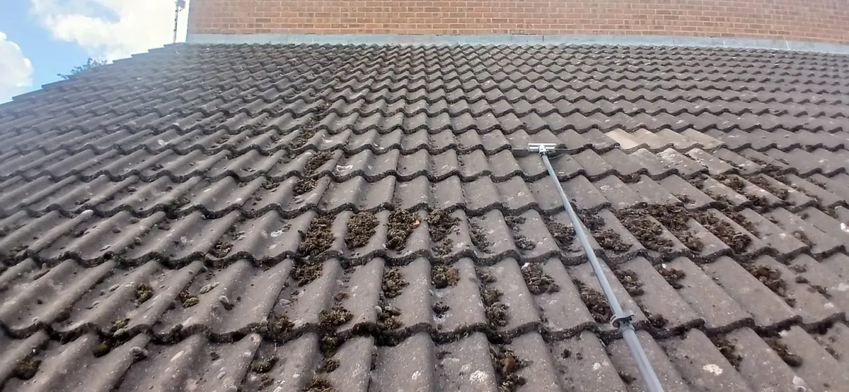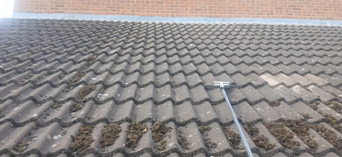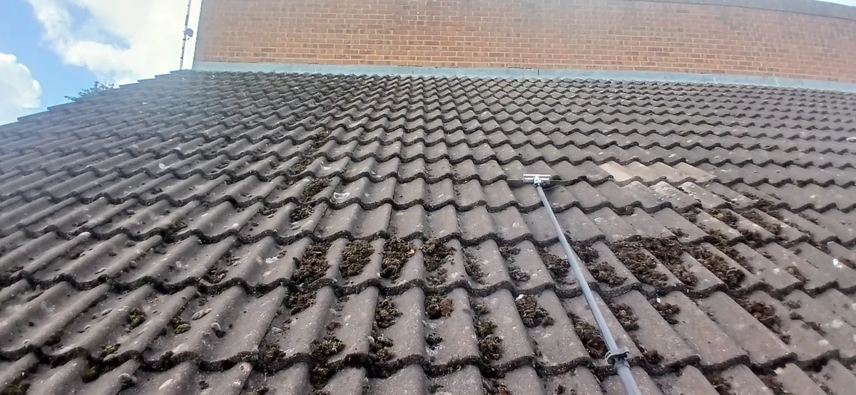 - Stage 2 - Soft washing. Once the moss is cleared, the roof is treated with a low-pressure cleaning solution that breaks down remaining algae, lichen patches, and biofilm at root level. Soft washing is the method recommended for concrete and clay tiles - it cleans without damaging the tile surface, mortar bedding, or flashings.