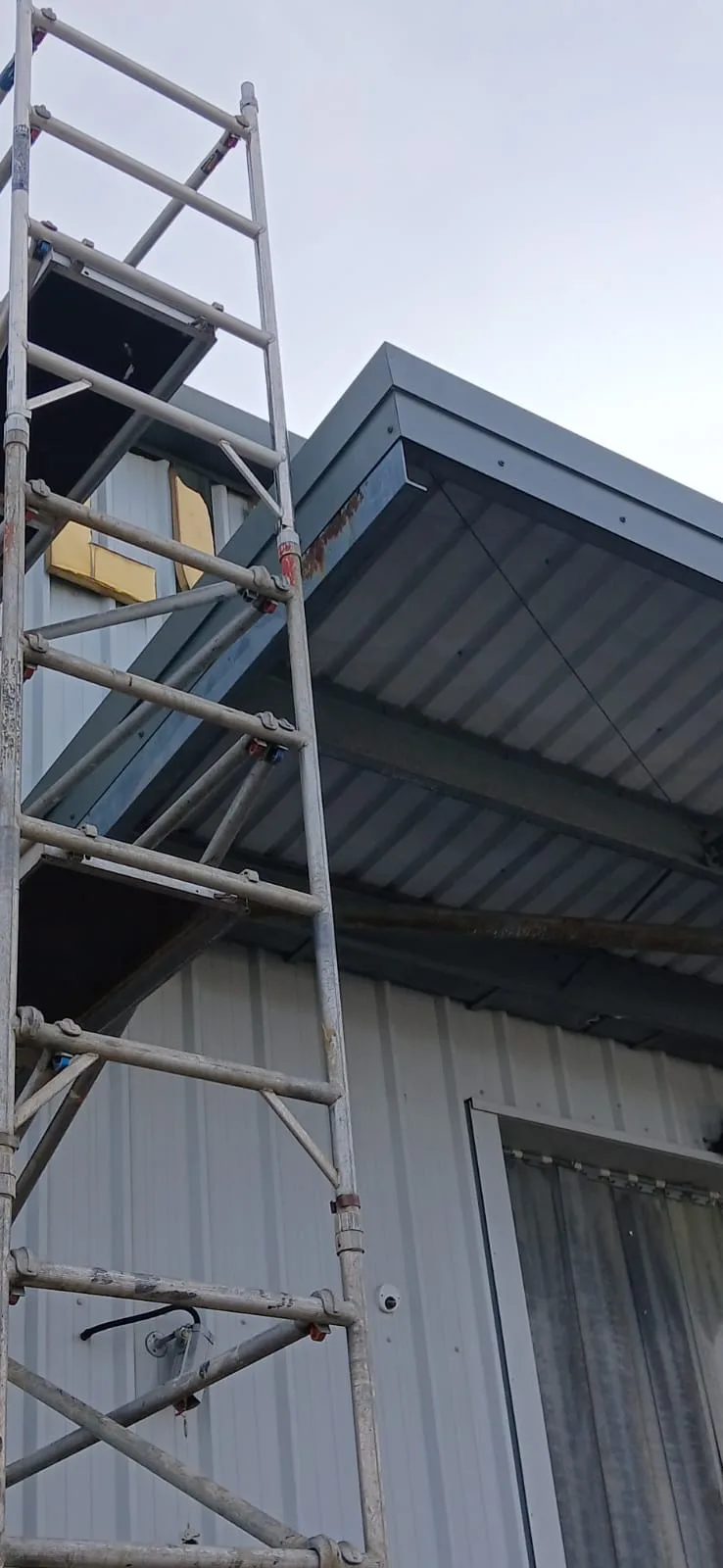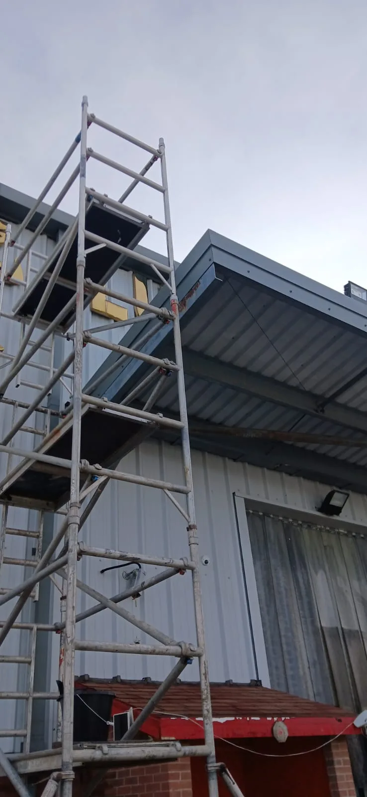 - Scaffold tower setup: Scaffold towers were erected around the building to provide safe, stable access to the roofline and upper cladding sections. This gave full reach across all elevations without relying on ladders or MEWP equipment.