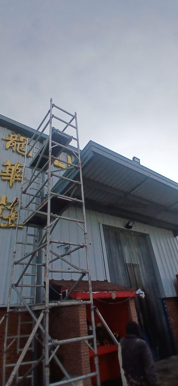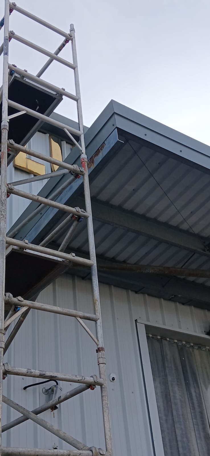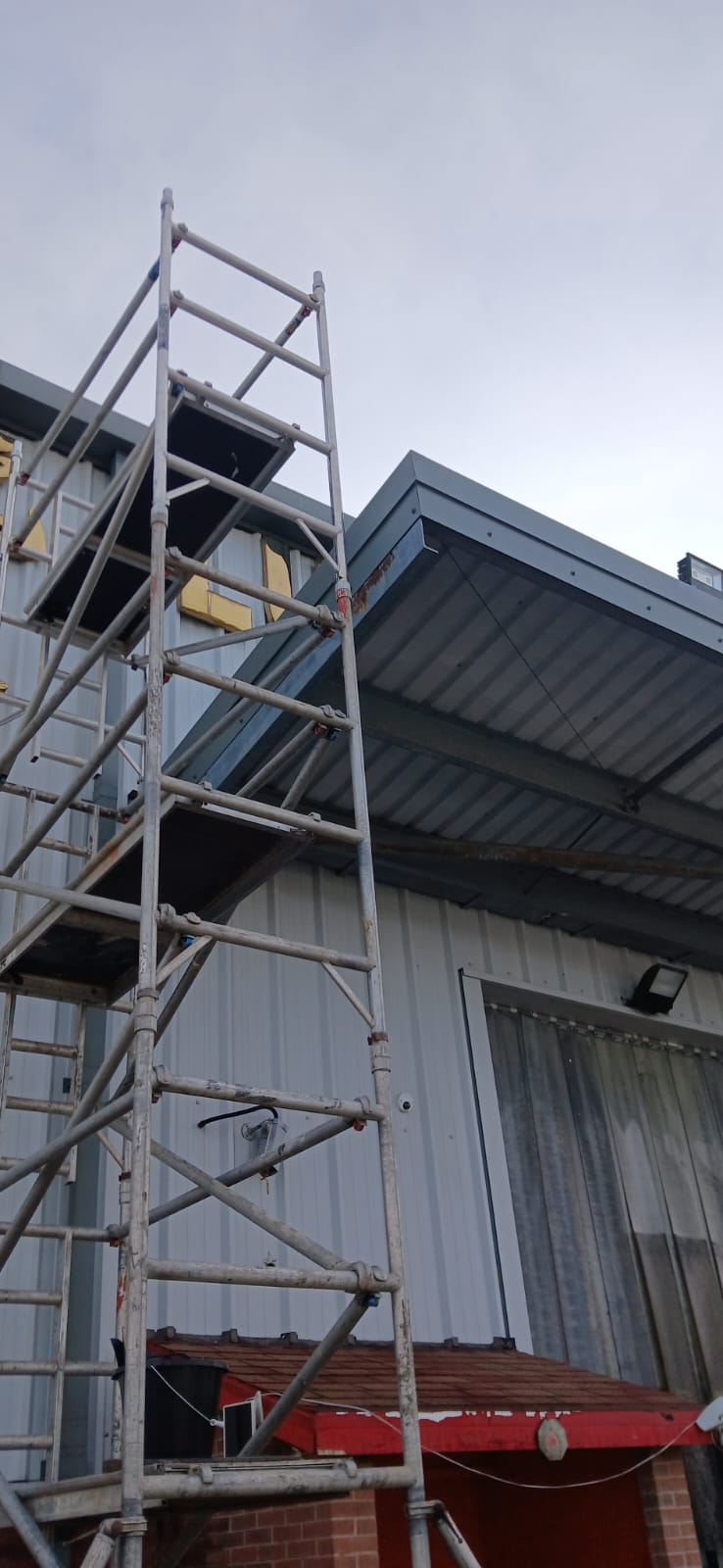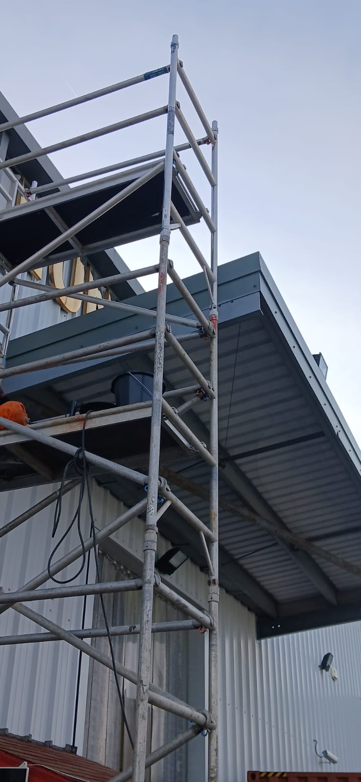Safe access for elevated sections was achieved using scaffold towers, allowing controlled cleaning across roof edges and cladding without cutting corners on reach or safety.