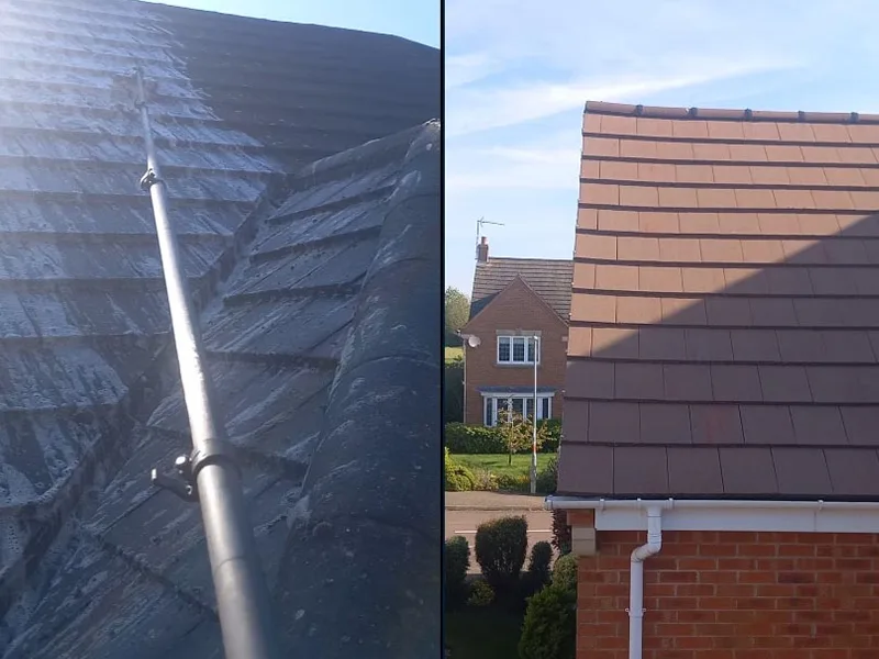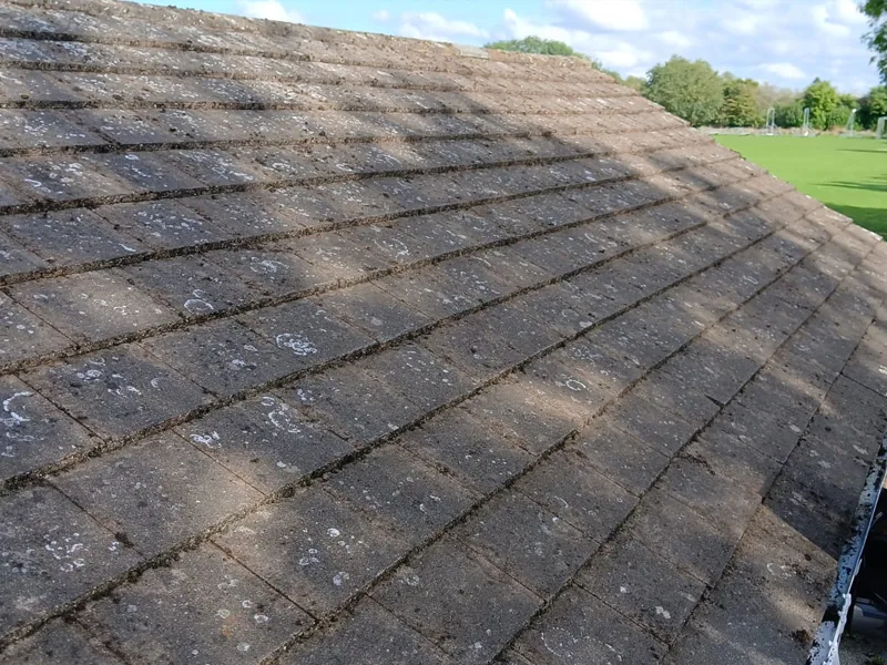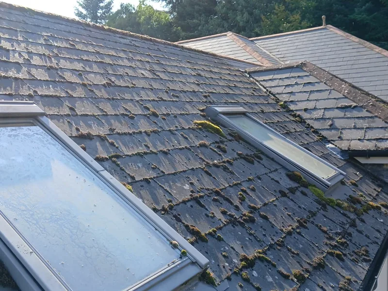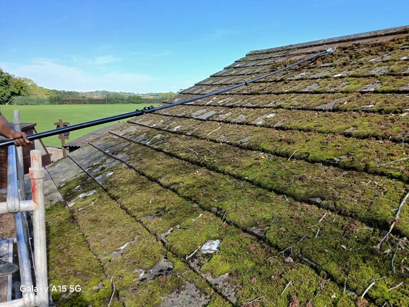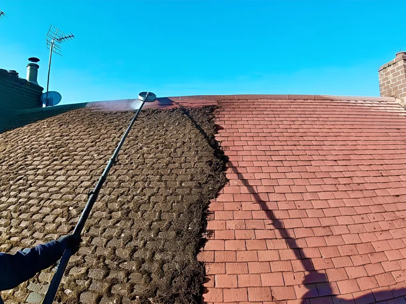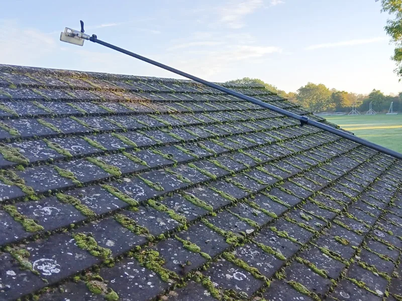 After we clear bulk moss, we use a biodegradable, bleach-based cleaning solution and soft wash the entire roof at low pressure. This process eliminates remaining algae, lichen, and moss spores at the root level. High-pressure jets are never used directly on roof tiles because they are likely to crack tiles, strip surface coatings, and push water under the tile line.